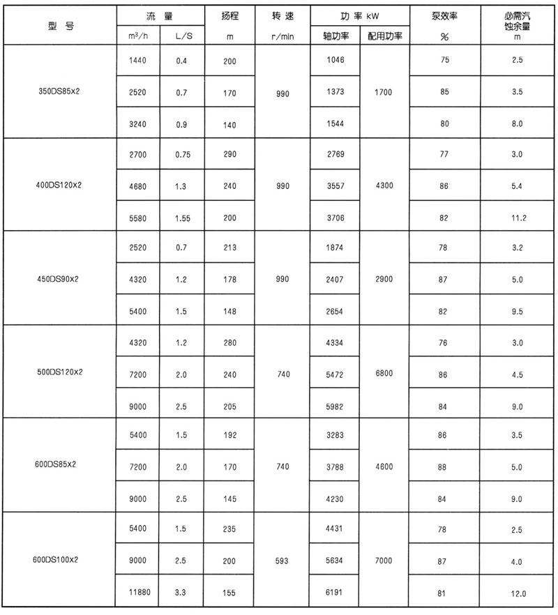 型號意義:以400DS-120×2為例 400-水泵進水口名義直徑(mm)DS一多級雙進口中開離心泵 120-水泵名義單級揚程(m) 2-水泵級數