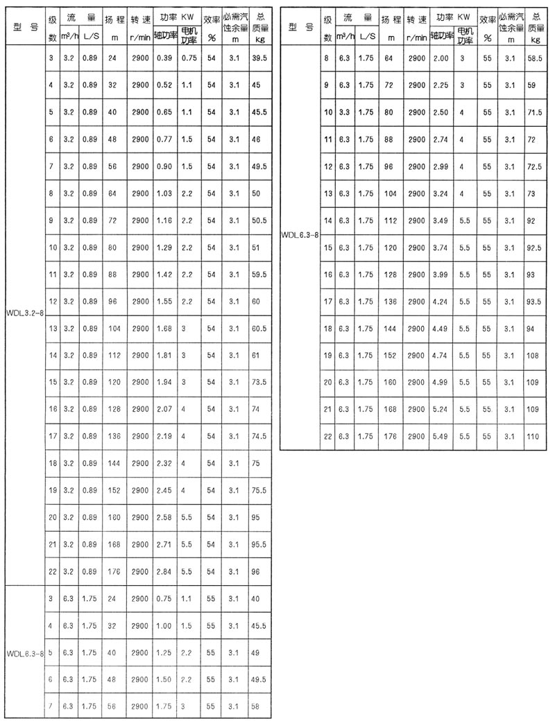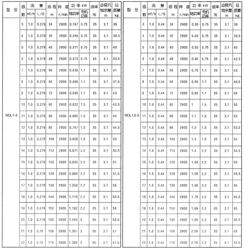 泵型號意義:如WDL1.6-8×10。1.6-流量(m/h);8-單級揚程(m);10-級數。