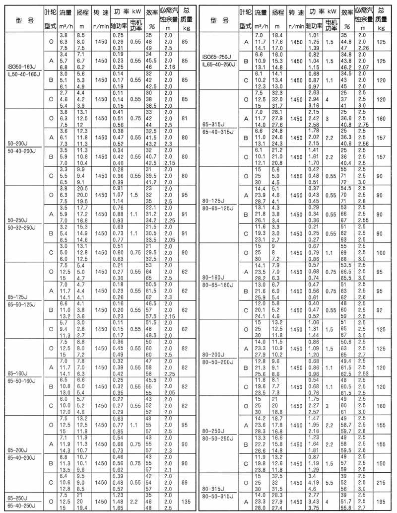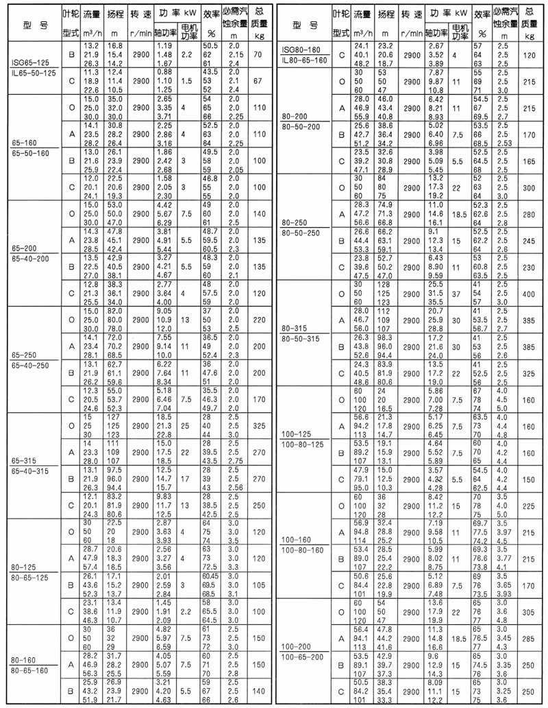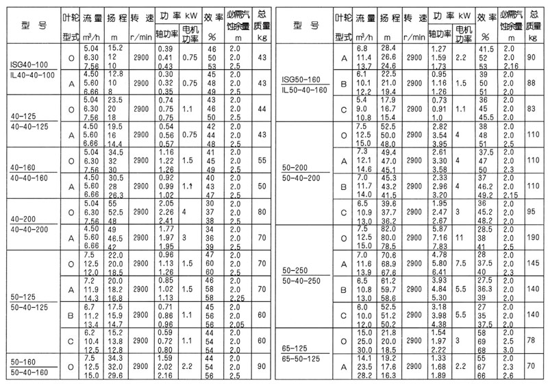 主要零件製造材料:泵體、泵蓋一(yī)鑄鐵(tiě)或球墨鑄(zhù)鐵;葉輪一鑄鐵或鑄銅;軸一碳鋼或不鏽鋼。泵型號中數字的意義:如ISG100--200,100--進、出口直徑(jìng)(mm),200--葉輪名義直徑。IL200-150-250B,200--進口直徑(mm),15 0--出口直徑(mm),250B—-葉(yè)輪直徑經第二次切割。